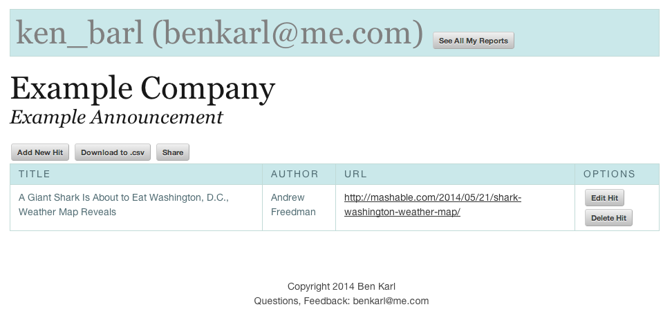 One thing every public relations professional has had to deal with is compiling coverage reports. This process typically involves searching for articles and then pasting information piece-by-piece into an excel grid. Now Coverage Reportr helps simplify that process by automating most of the data entry and allowing multiple users to collaborate on a single report. You can even download your reports to .csv and send them as attachments or use the data for other applications.