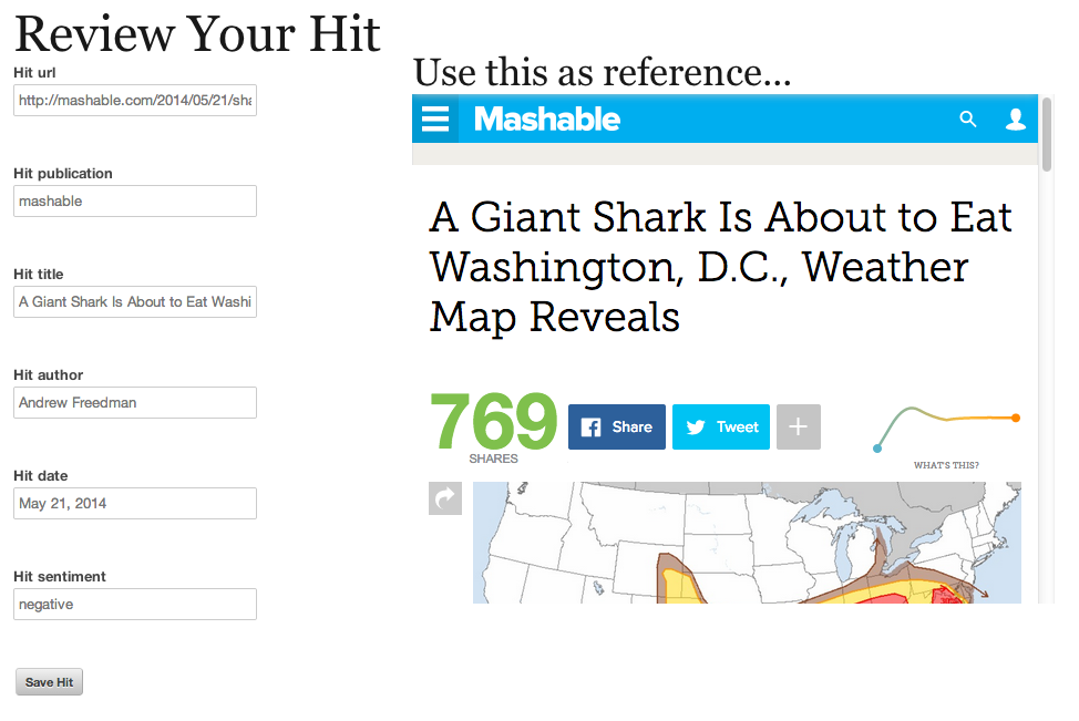 Submit the URL and the article's publication, title, author, tone and today's date will automatically populate the fields in the edit page. Validate that the information is correct, hit submit, and your hit will be added to your report!