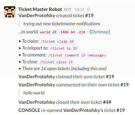 GTicketMaster can integrate with your Slack team, using incoming WebHooks. This integration works by announcing new tickets to a given channel. It shows the player's head and name, as well as the ticket ID, description and Dynmap link (if available).