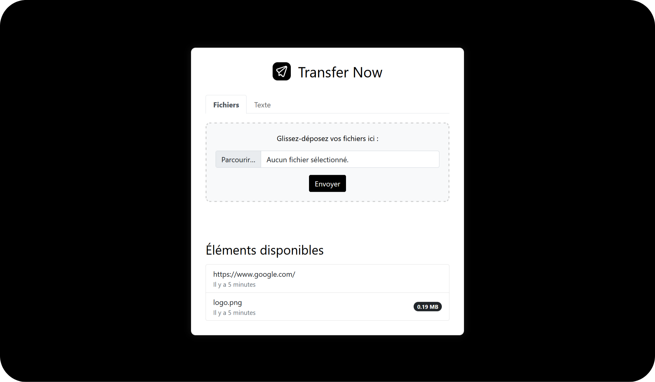 Transfer Now Cet outil vous permet de transférer rapidement des éléments de votre téléphone à votre ordinateur, ou inversement. Code PIN Pour utiliser ce projet, ajoutez un fichier "./config.php". <?php define('ACCESS_PIN', '0000');