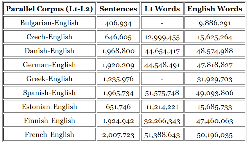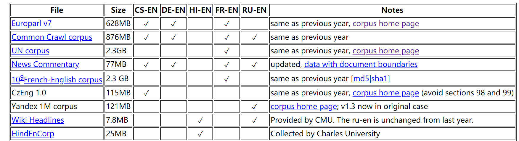常用数据集有WMT系列,IWSLT系列,中文还有NIST系列。翻译数据集众多,场景繁琐,同一系列的数据集在预处理,后处理,评测方法等方面也有不同。翻译数据的基本格式就是(源语言,目标语言)得句子对,也称平行语料。
