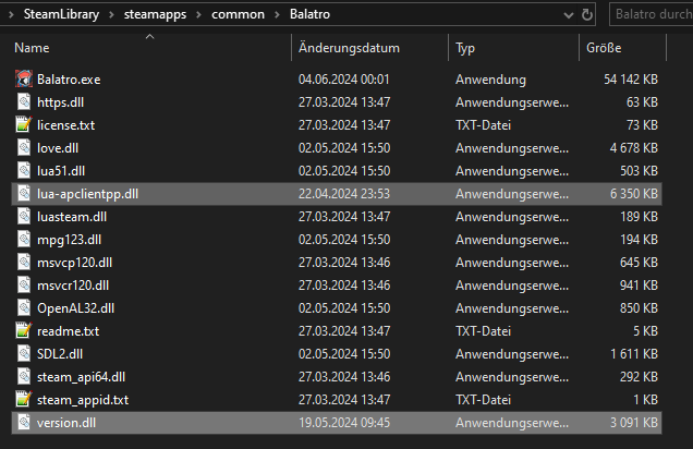 From the lua51.7z extract the file lua51-clang64-dynamic > lua-apclientpp.dll and put it into your Balatro installation folder (the same folder you put Lovely's version.dll when installing Steamodded).