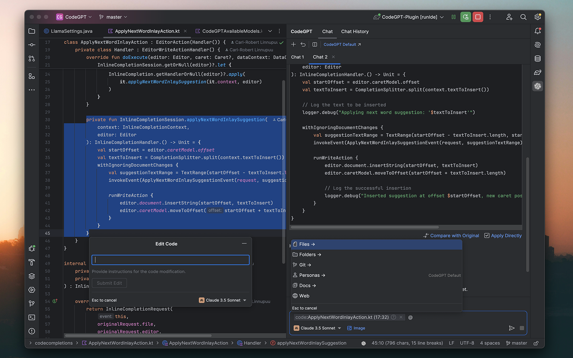 Edit code in natural language: Highlight the code you want to modify, describe the desired changes, and watch ProxyAI work its magic.