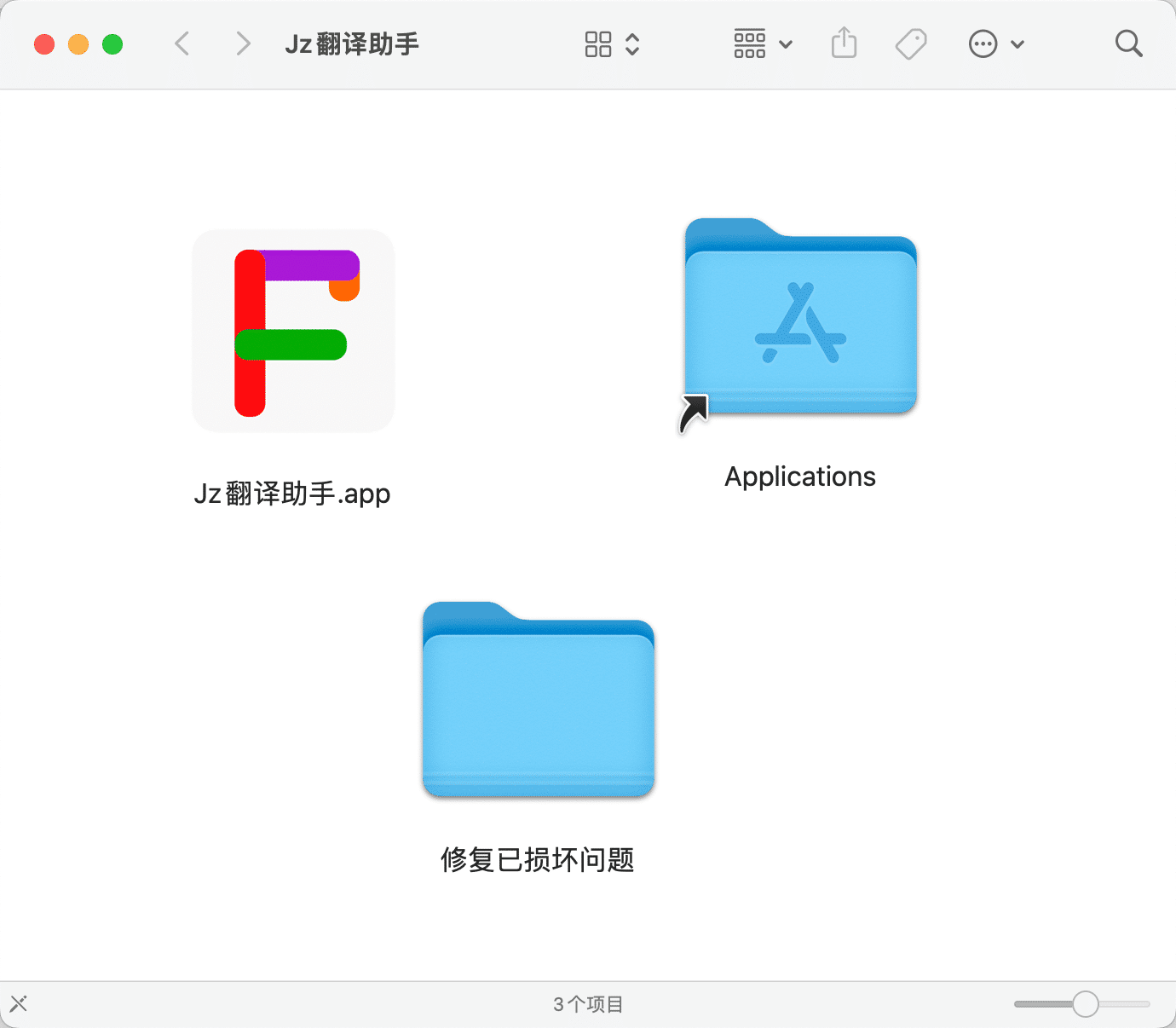 饺子翻译助手.dmg安装程序.然后将==Jz翻译助手==拖到应用程序中,即可完成安装