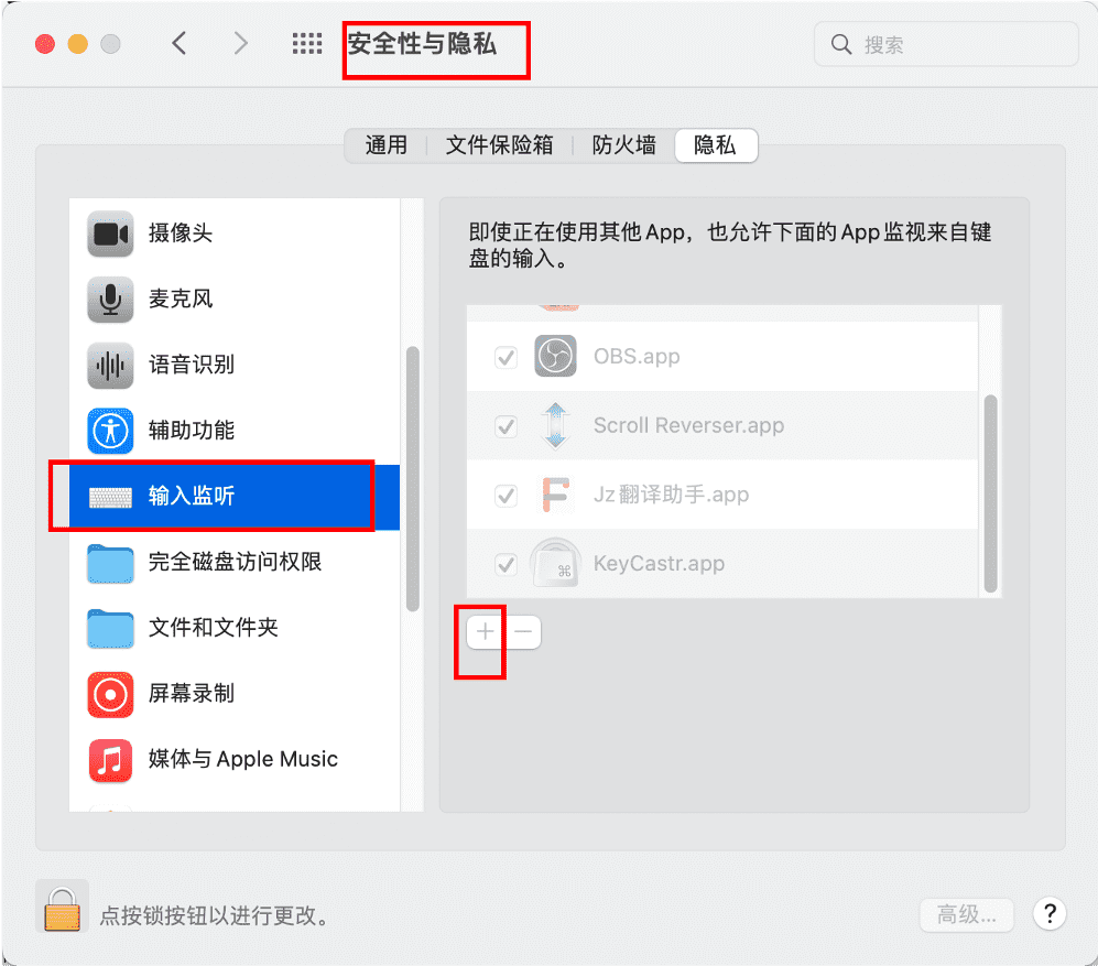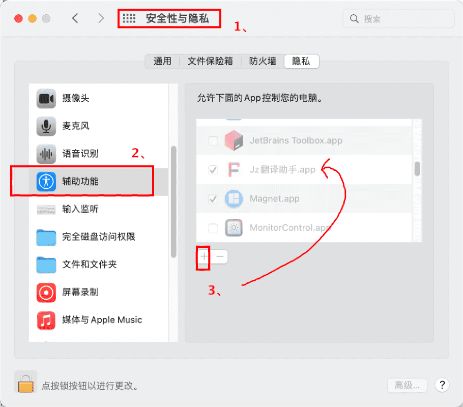 系统偏好设置->>安全性及隐私->>辅助功能->> 将Jz翻译助手,添加进去输入监听权限(==1.4.0以前的版本需要==):系统偏好设置->>安全性及隐私->>输入监听->> 将Jz翻译助手,添加进去重启软件后就可正常运行