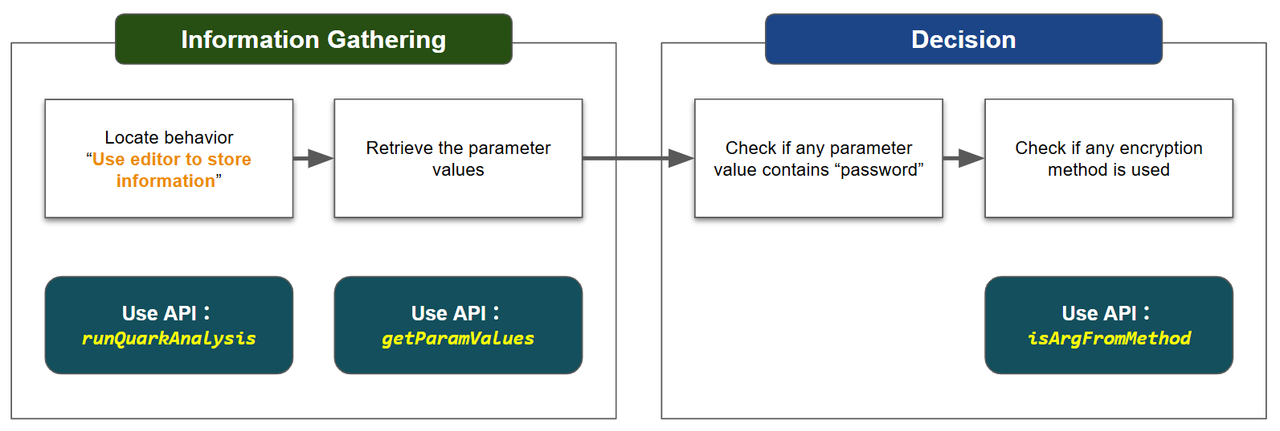 behaviorInstance.getParamValues()to retrieve all parameter values associated with this behavior. We then check whether any parameter contains keywords that suggest it is being used as a password (e.g.,password,pswd, orpasswd).Finally, we use