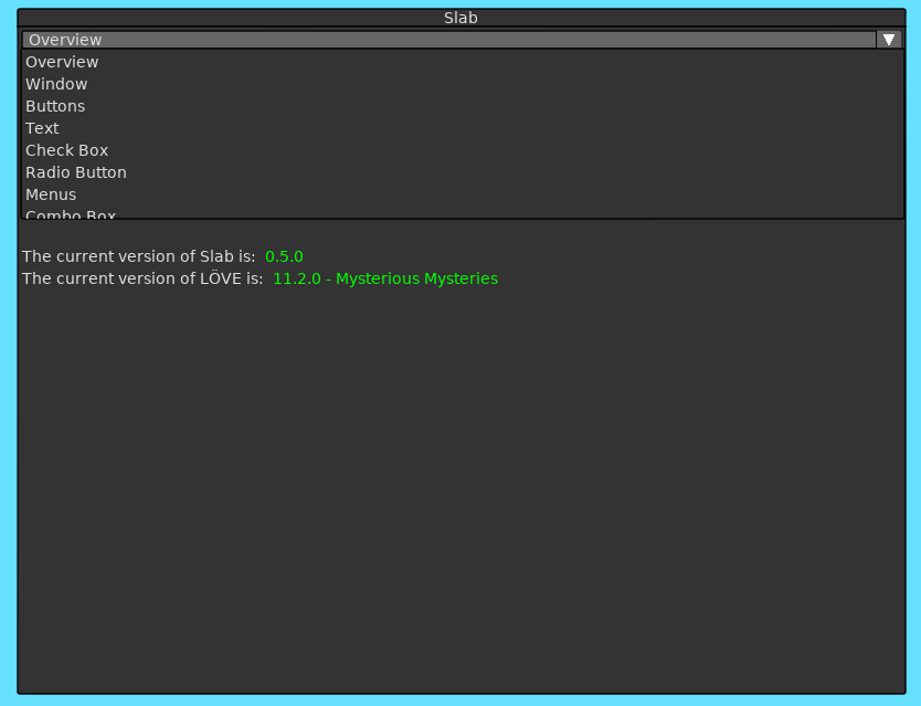 Slab is an immediate mode GUI toolkit for the Love 2D framework. This library is designed to allow users to easily add this library to their existing Love 2D projects and quickly create tools to enable them to iterate on their ideas quickly. The user should be able to utilize this library with minimal integration steps and is completely written in Lua and utilizes the Love 2D API. No compiled binaries are required and the user will have access to the source so that they may make adjustments that meet the needs of their own projects and tools. Refer to main.lua and SlabTest.lua for additional example usage of this library.
