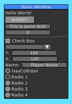 Slab.BeginWindow('MyFirstWindow', {Title = "My First Window"})
