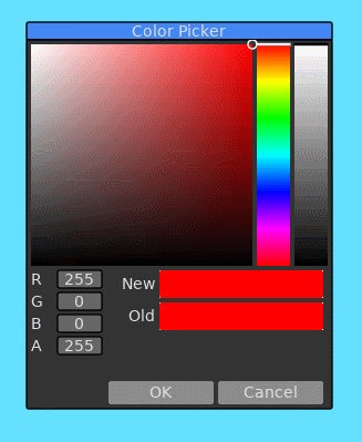 The color picker displays a window that allows the user to select a color on the spectrum. The window displays the saturation of the current hue, a hue picker, and an alpha picker. There are also input fields for each channel in RGBA in the 0 - 255 range. The API, however, takes in and returns color in the normalized 0 - 1 range.