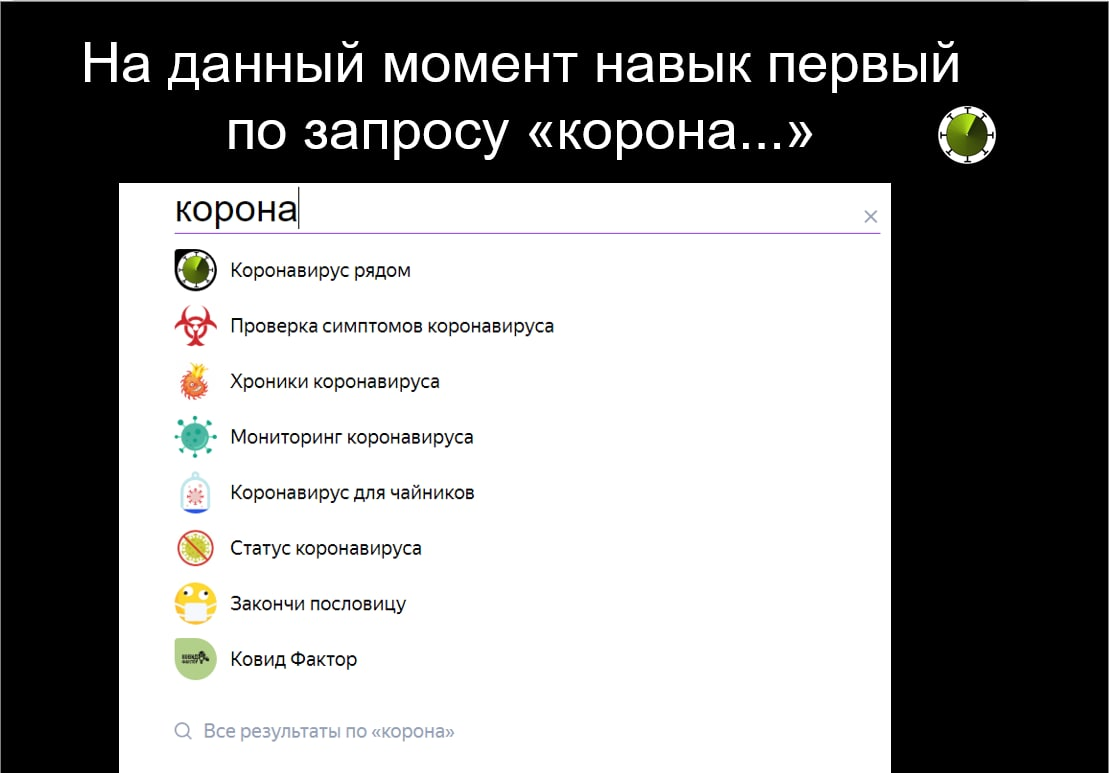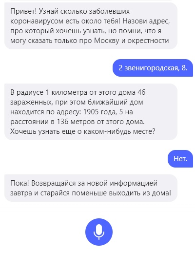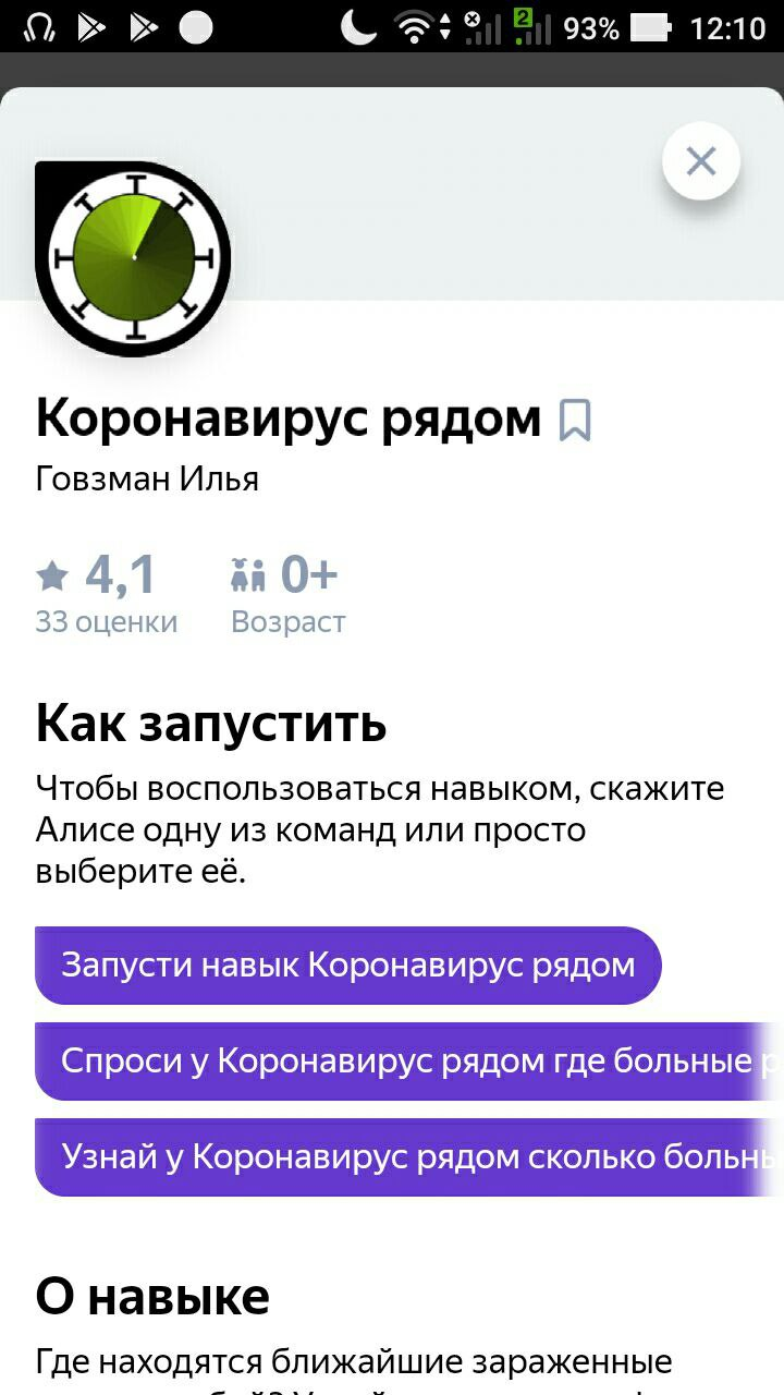 Коронавирус рядом - навык для Алисы (голосовой помощник). На текущий момент навык отключен и в системе не отображается! Он позволяет смотреть где находятся заболевшие рядом с запрашиваемым адресом и узнавать, сколько их.