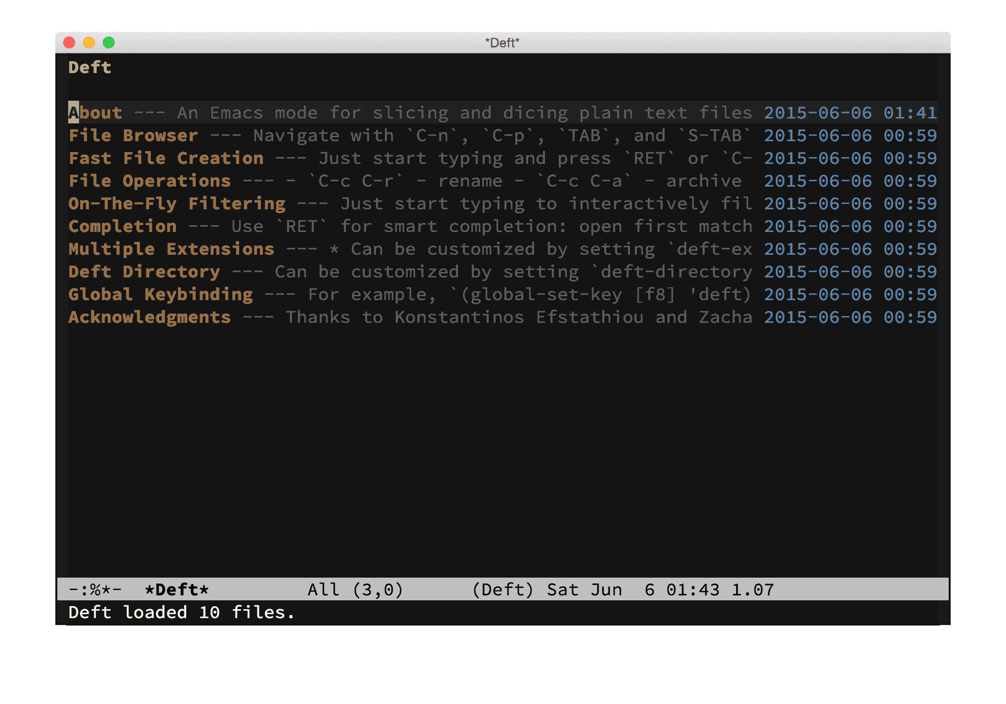 The Deft buffer is simply a file browser which lists the titles of all text files in the Deft directory followed by short summaries and last modified times. The title is taken to be the first line of the file and the summary is extracted from the text that follows. Files are, by default, sorted in terms of the last modified date, from newest to oldest.