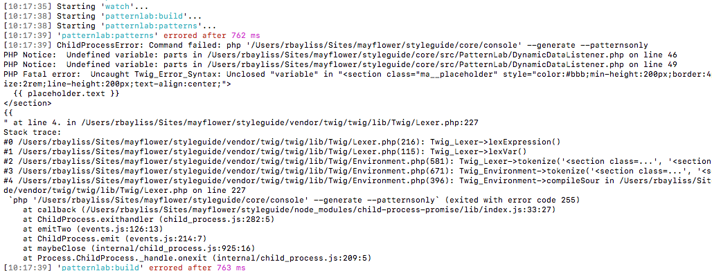 When pattern lab builds break, error messages were being suppressed. This should surface them again.