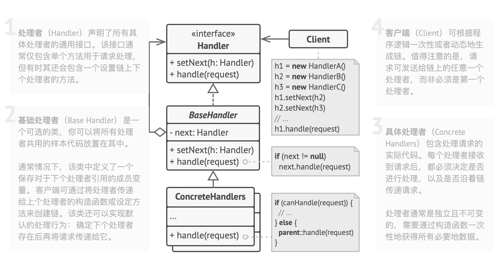 - 将各个处理者间承转的工作放到处理者内部,这样就可以很容易的增删改责任链中的处理者;