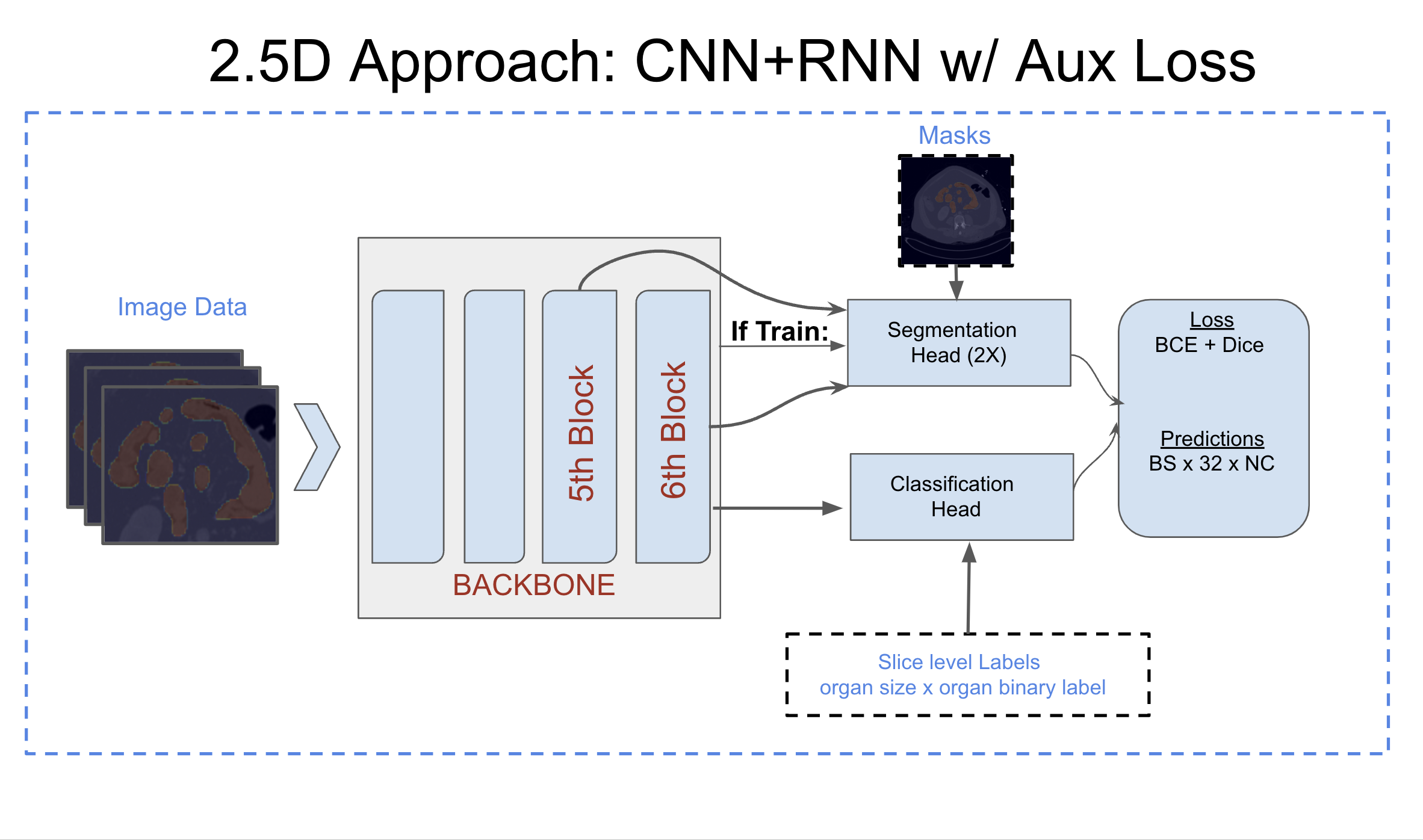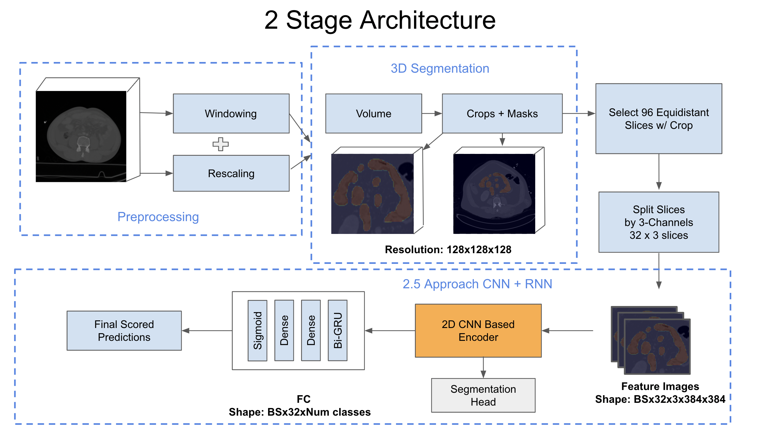 In stage 2, we trained our models using the volumes either based on our windowing or theo's preprocessing approach and the masks/crops generated from 3D segmentation approach. Each model is trained for multiple tasks (segmentation + classification). For all 32 sequences, we predicted slice level masks and sigmoid predictions. Further, simple maximum aggregation is applied on sigmoid predictions to fetch study level prediction used in submissions.