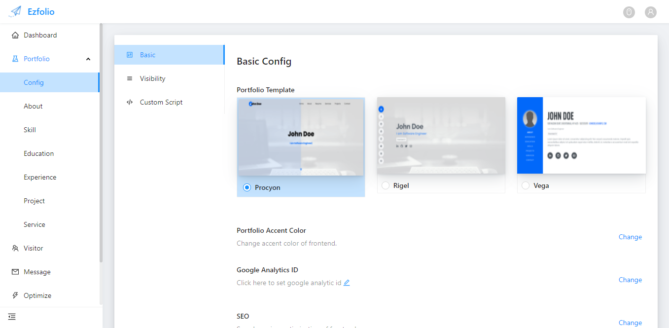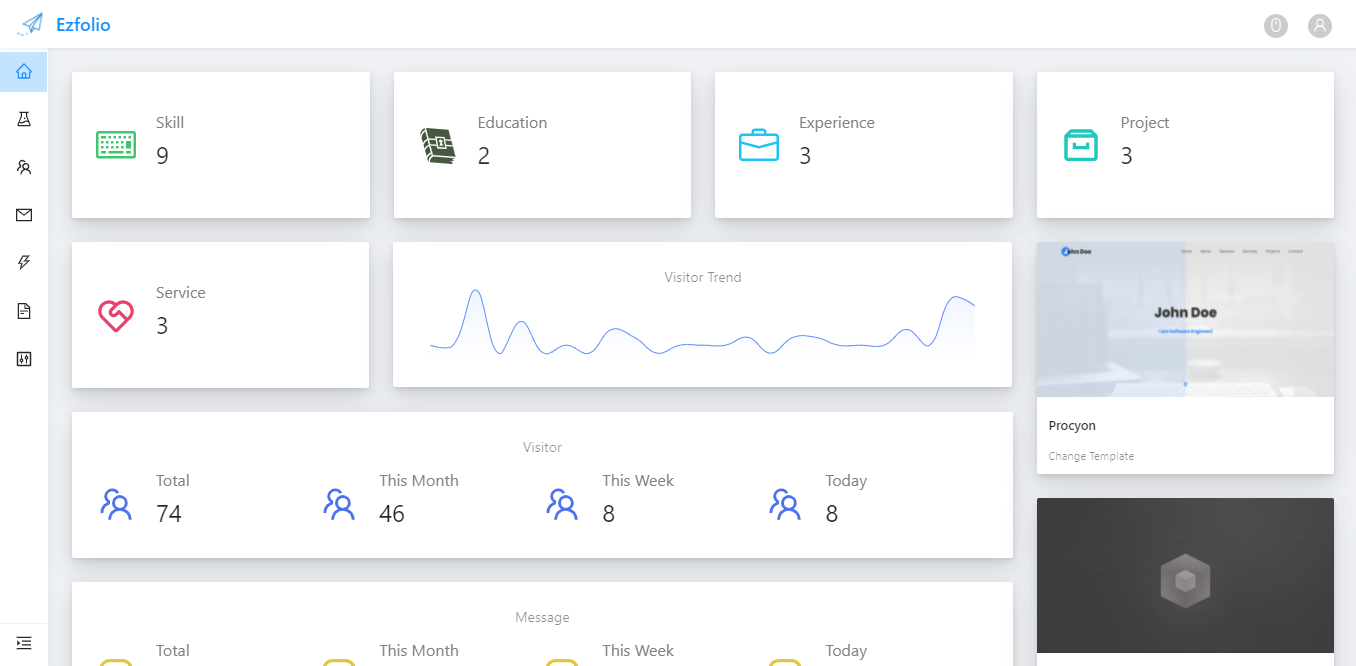 Ezfolio is a professional open source portfolio CMS built using Laravel, React and Ant Design. Choose from awesome templates and control what you like to show your audience. It offers a minimalist admin interface with lots of option for customizations. Get all the features of a portfolio site including visitor tracking, google analytics, maintenance mode, contact form, SEO and many more.
