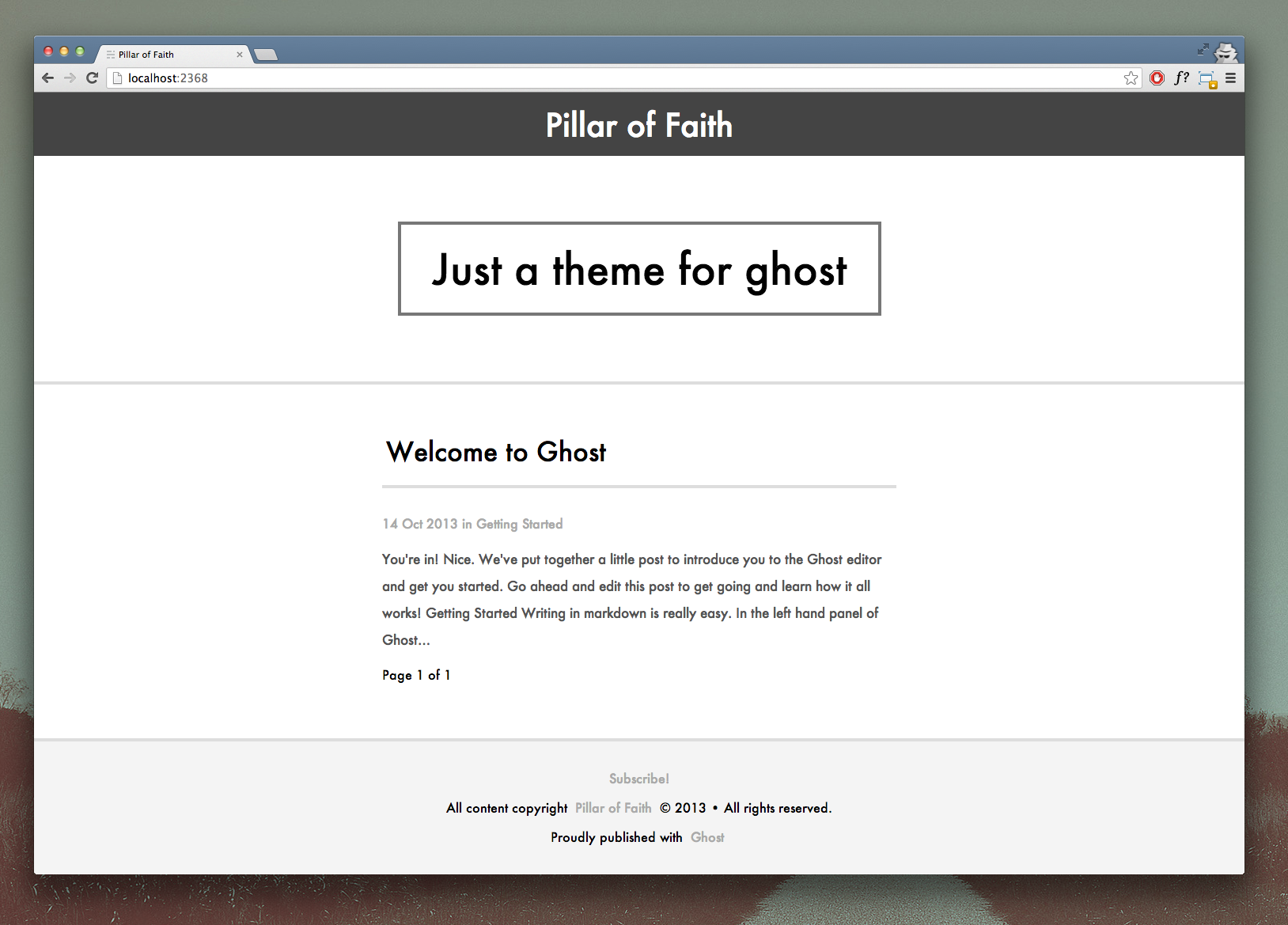 Pillar of Faith A somewhat minimal theme for the Ghost blogging platform. Here are some screenshots. @1530px: @650px: @400px: