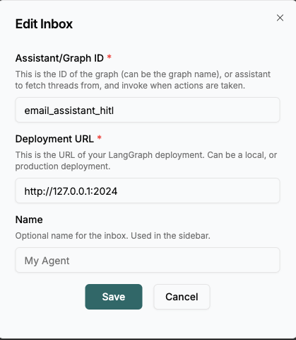 email_assistant_hitl,和langgraph.json中的email_assistant_hitl对应 - Deployment URL 为本地服务的地址
