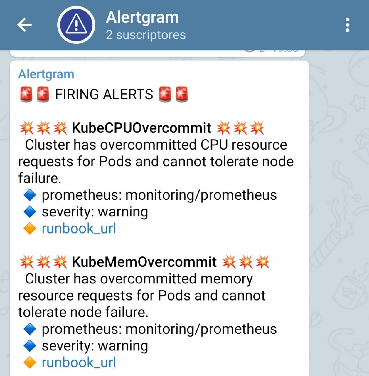 With this setup if Prometheus fails creating the alert, Alertmanager sending the alert to Alertgram, or Alertgram not receiving this alert (e.g. network problems), Alertmanager will send an alert to Telegram to notify us that our monitoring system is broken.