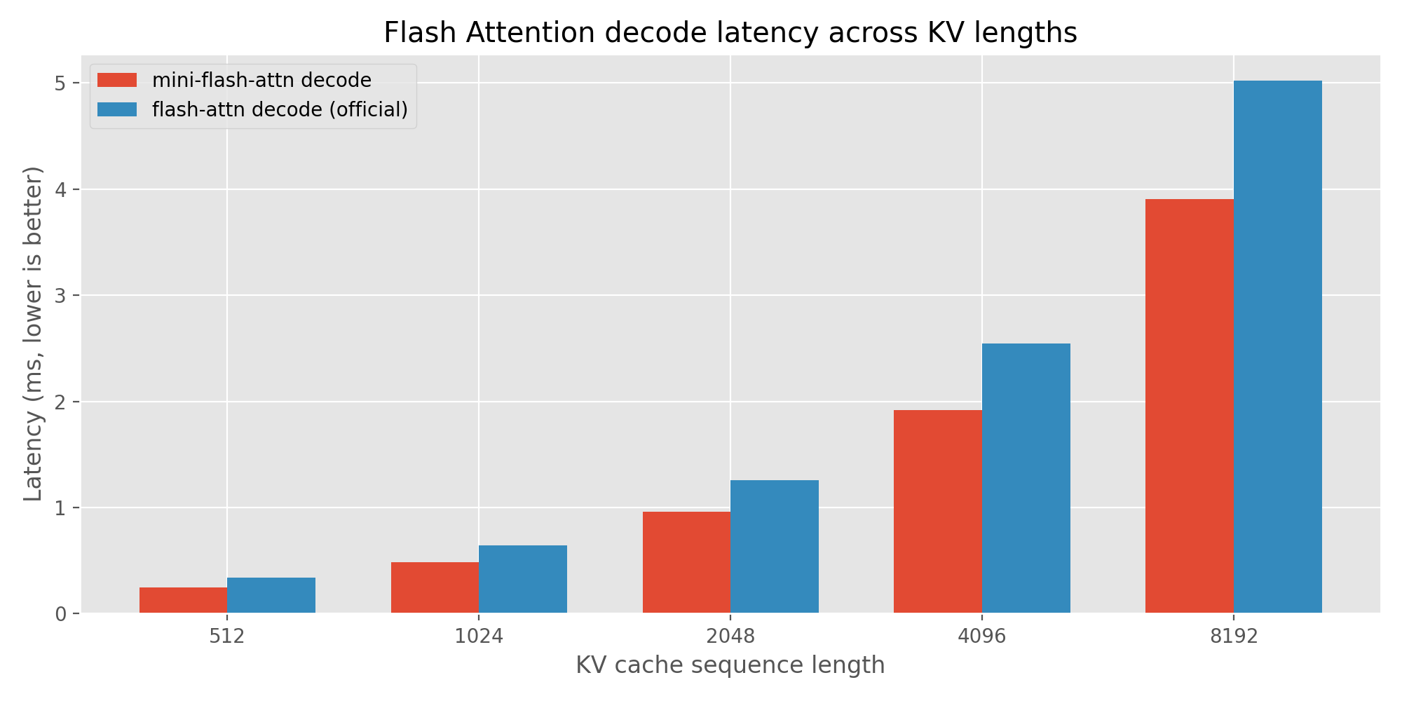 | KV Length | Mini Flash Attention | Official Flash Attention | Speedup |