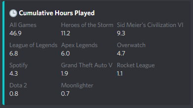 Game Name> -cumulative playtime for the specified Game Name. - .time <