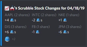 stock> <shares> -to invest in shares of a stock. Cost is 1-1 with real world price. - .invest-scrubbles <