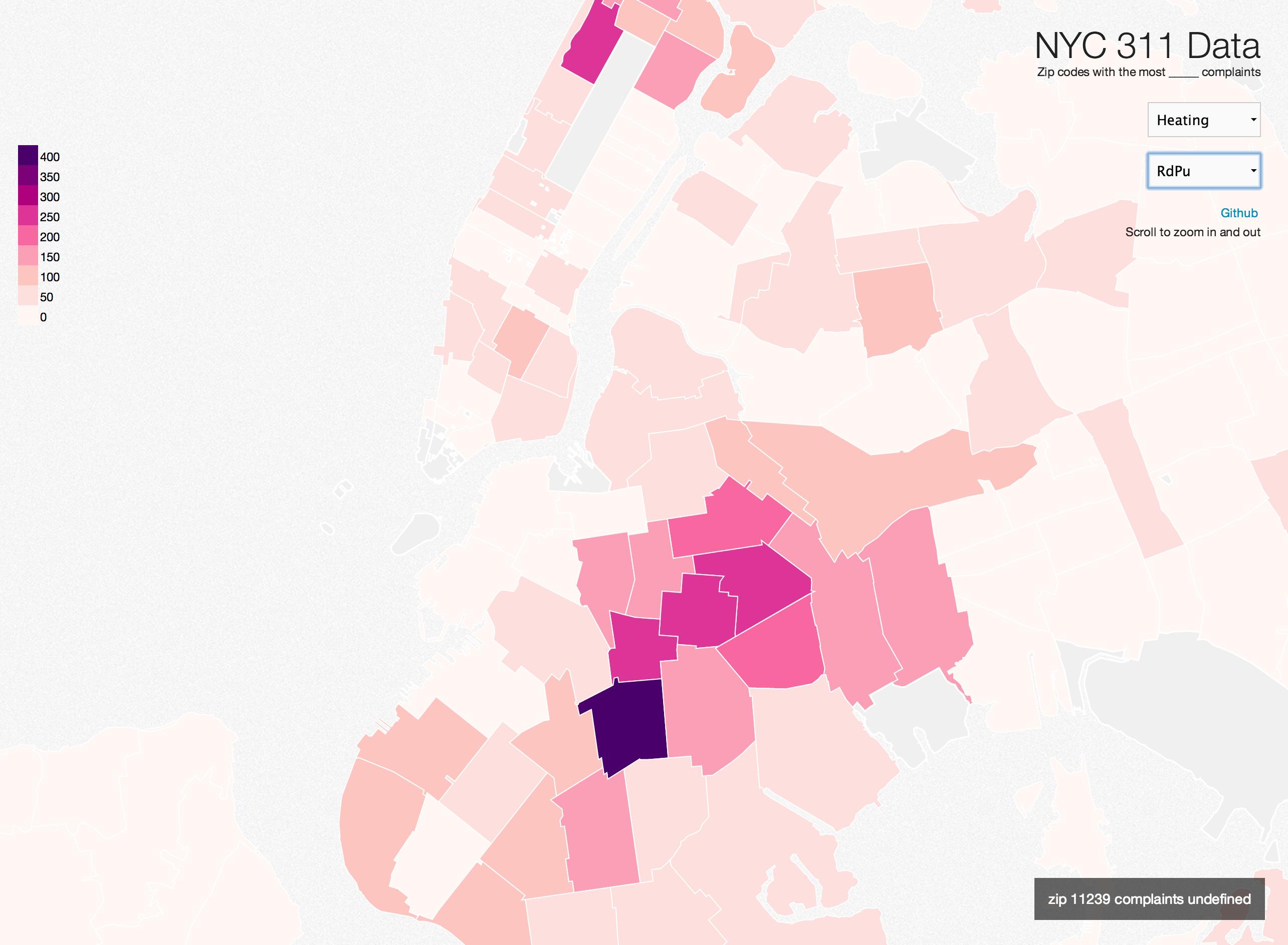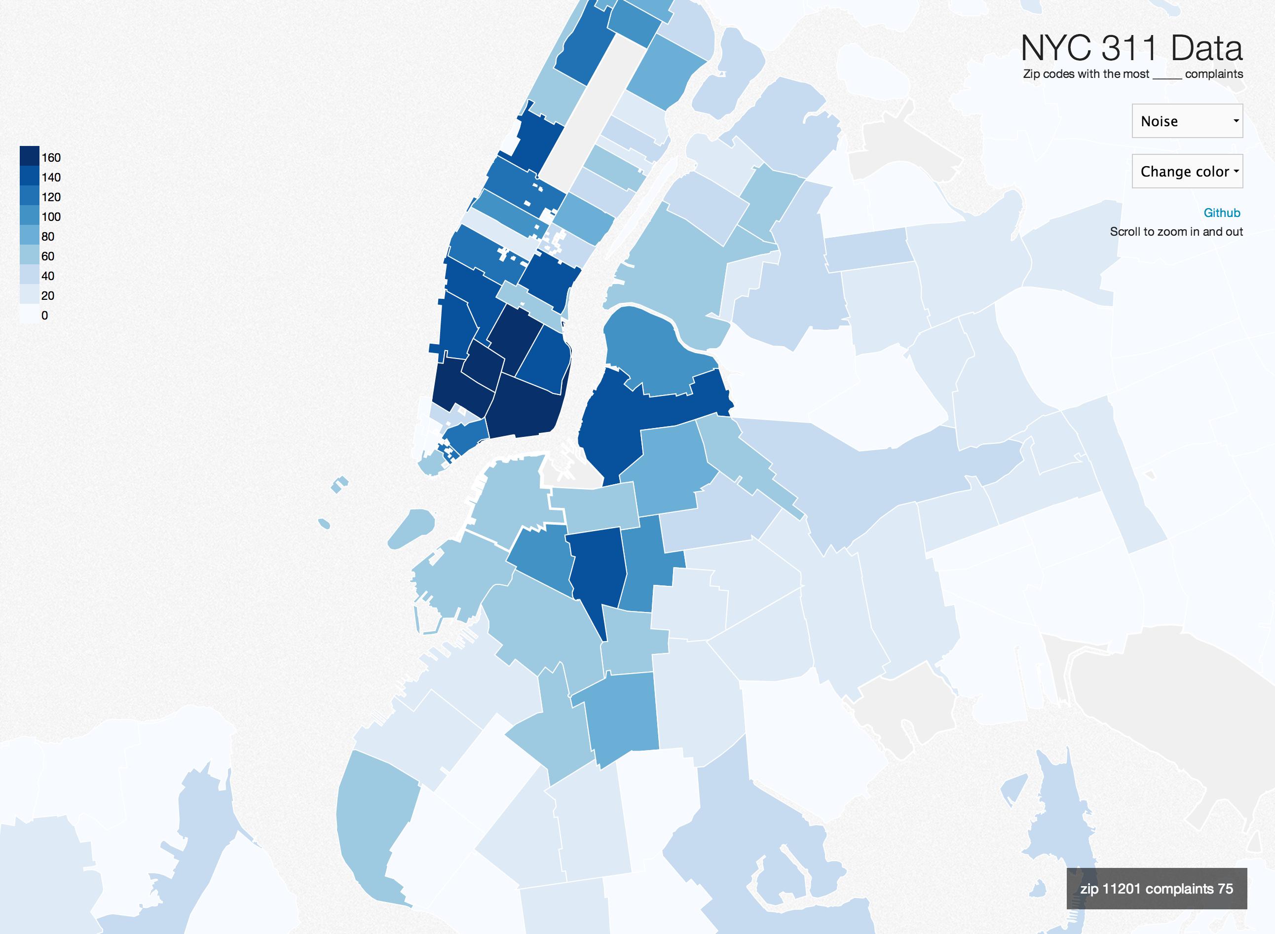 D3 Choropleth of the noisiest neighborhoods in NYC.